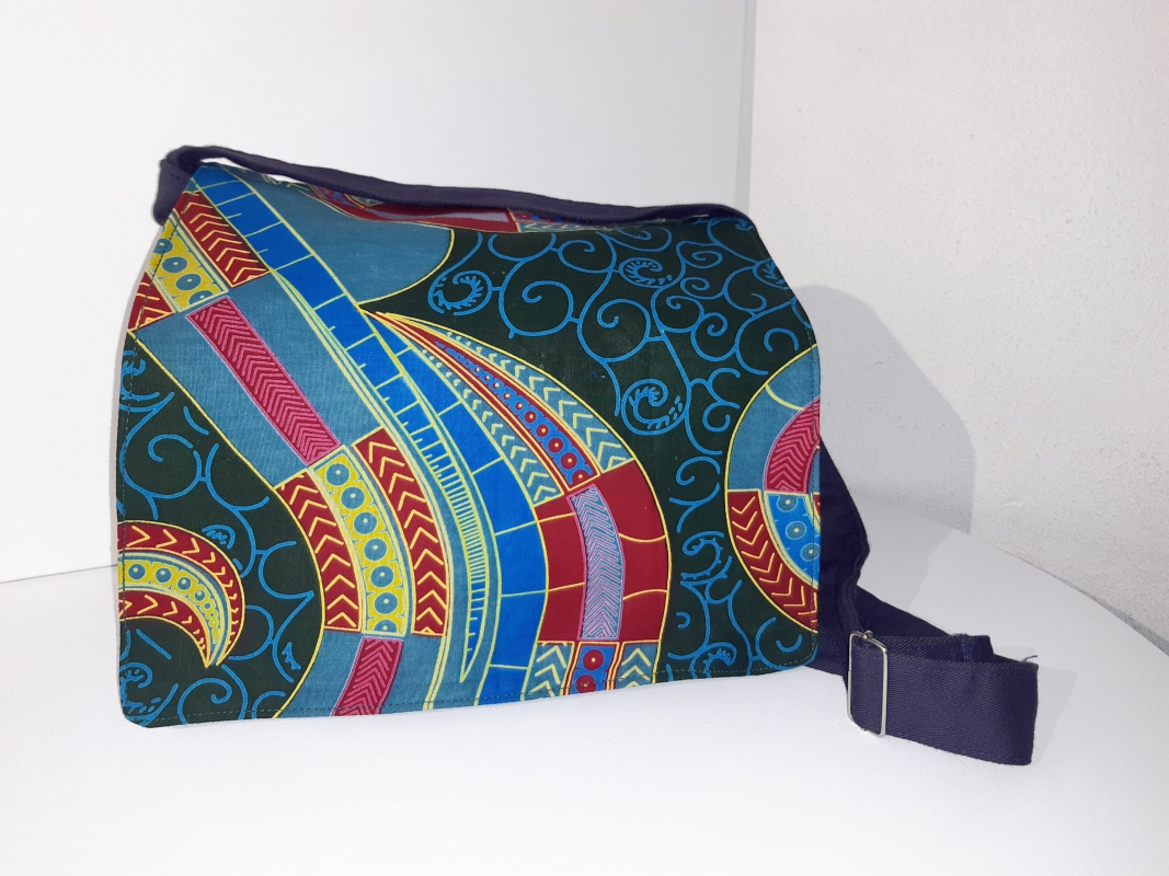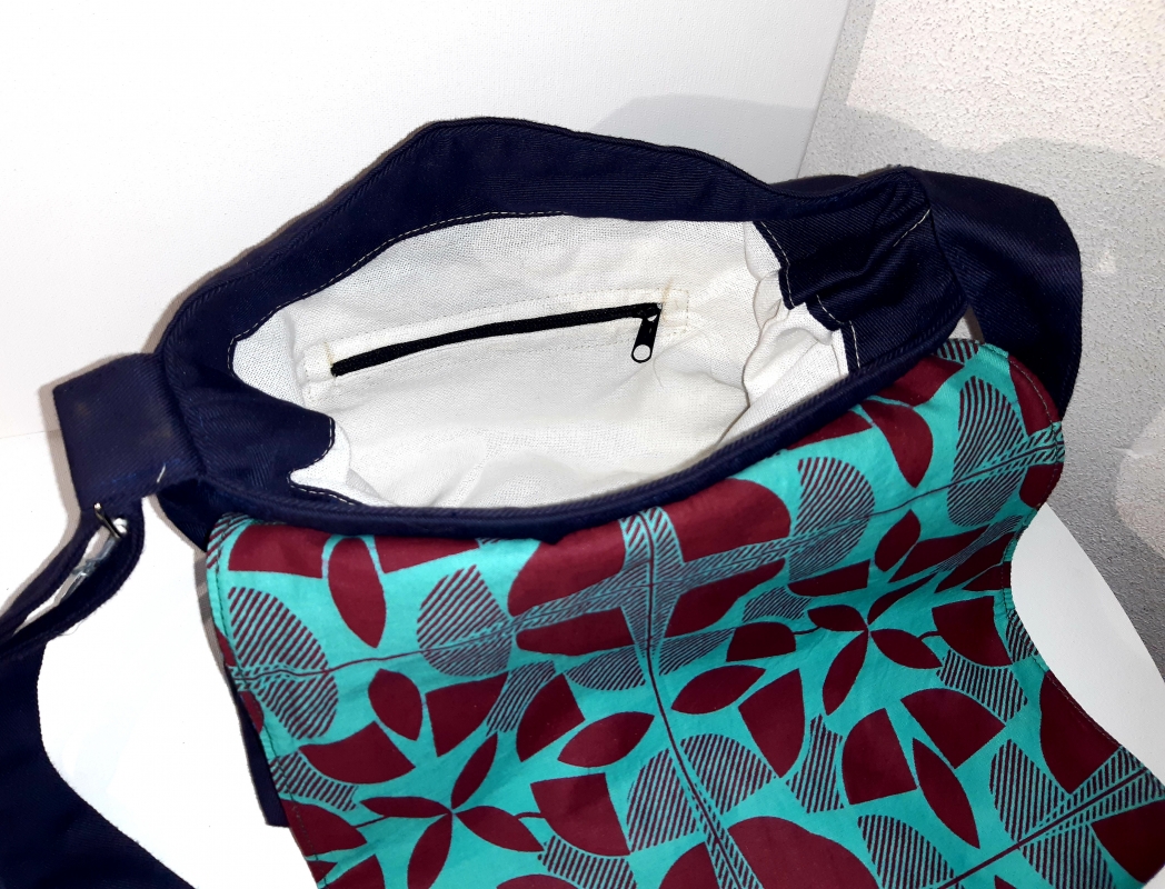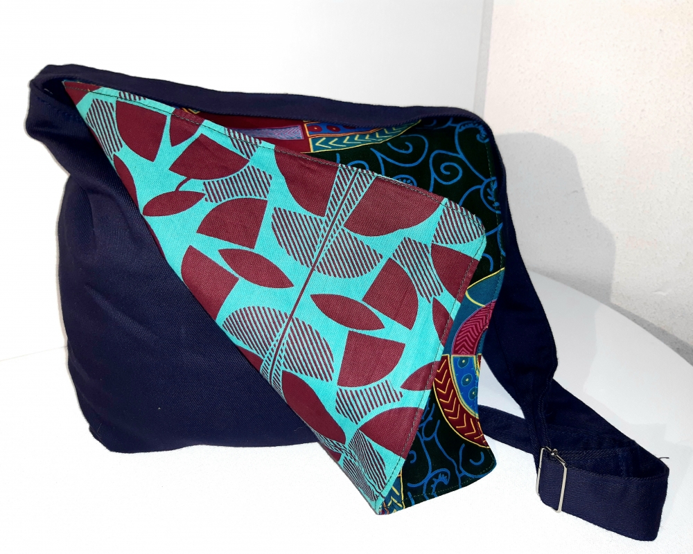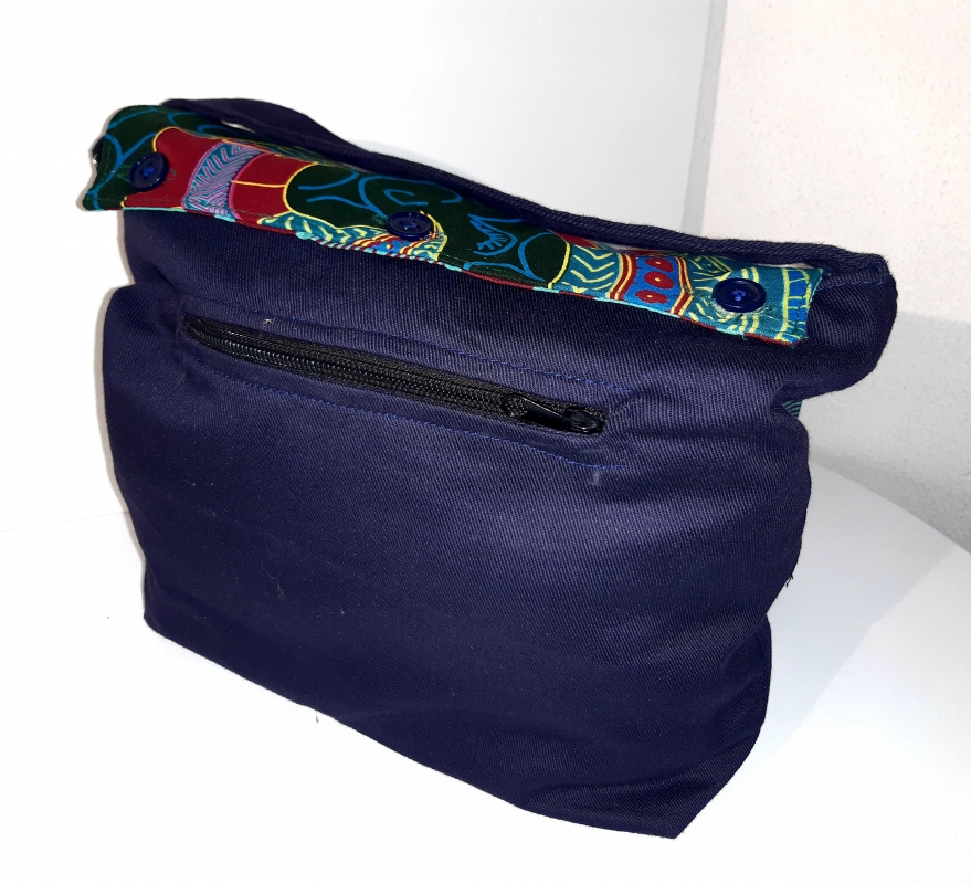 Sac/bleu Sac à main toile et wax. Rabat double face. Changez de face selon votre envie (3 boutons). Grande poche centrale et deux poches à fermeture éclair (1 au dos, 1 petite à l 'intérieur).