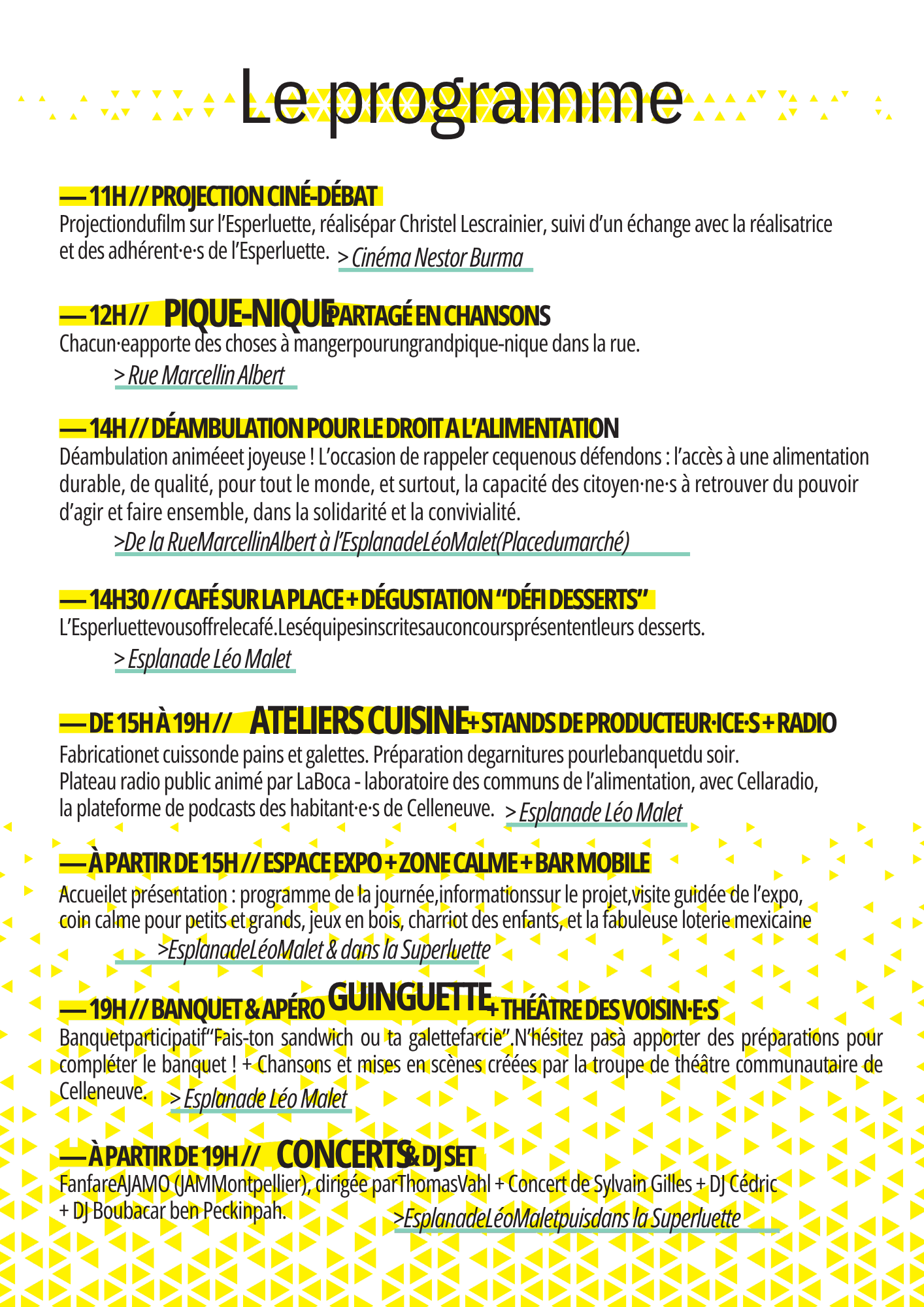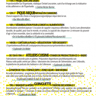 - Un plateau radio public animé par LaBoca - laboratoire des communs de l’alimentation, avec Cellaradio de l'association Odette Louise, la plateforme de podcasts des habitant·e·s de Celleneuve