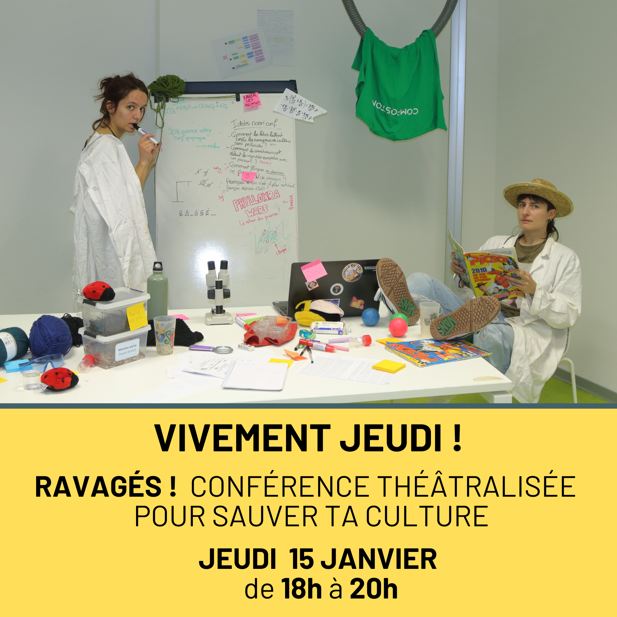 "Les ravageurs de cultures sont une des plus grandes menaces pour l'agriculture aujourd'hui, et pourraient bien finir par vous retirer le contenu de votre assiette. À travers une conférence théâtralisée humoristique, Louise et Yaël nous invitent à découvrir ce qui se cache derrière les portes des laboratoires qui luttent contre ce fléau en cherchant des solutions durables et respectueuses de l'environnement."